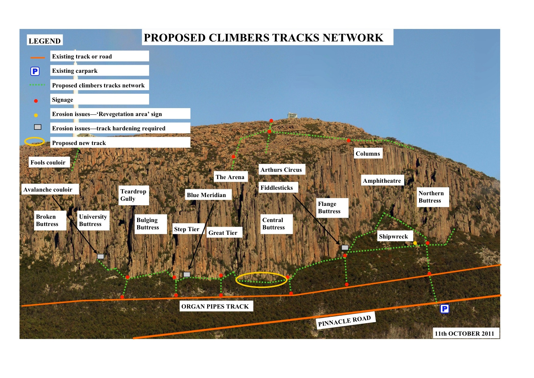 Tony, Phil and I have been working with the Council to provide improved facilities for climbers to the Organ Pipes in Wellington Park. The objective of this work is achieve the following outcomes: