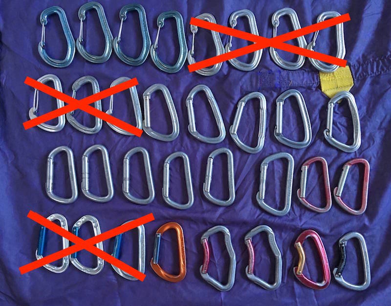 NB: all the older $5 biners are gone. There are now 26 biners left. Prices from $7 for the likes of standard BD straight gate or wire gate biners to $9 for super lightweight Climbing Technologies or super bombproof BD Hotwire biners.