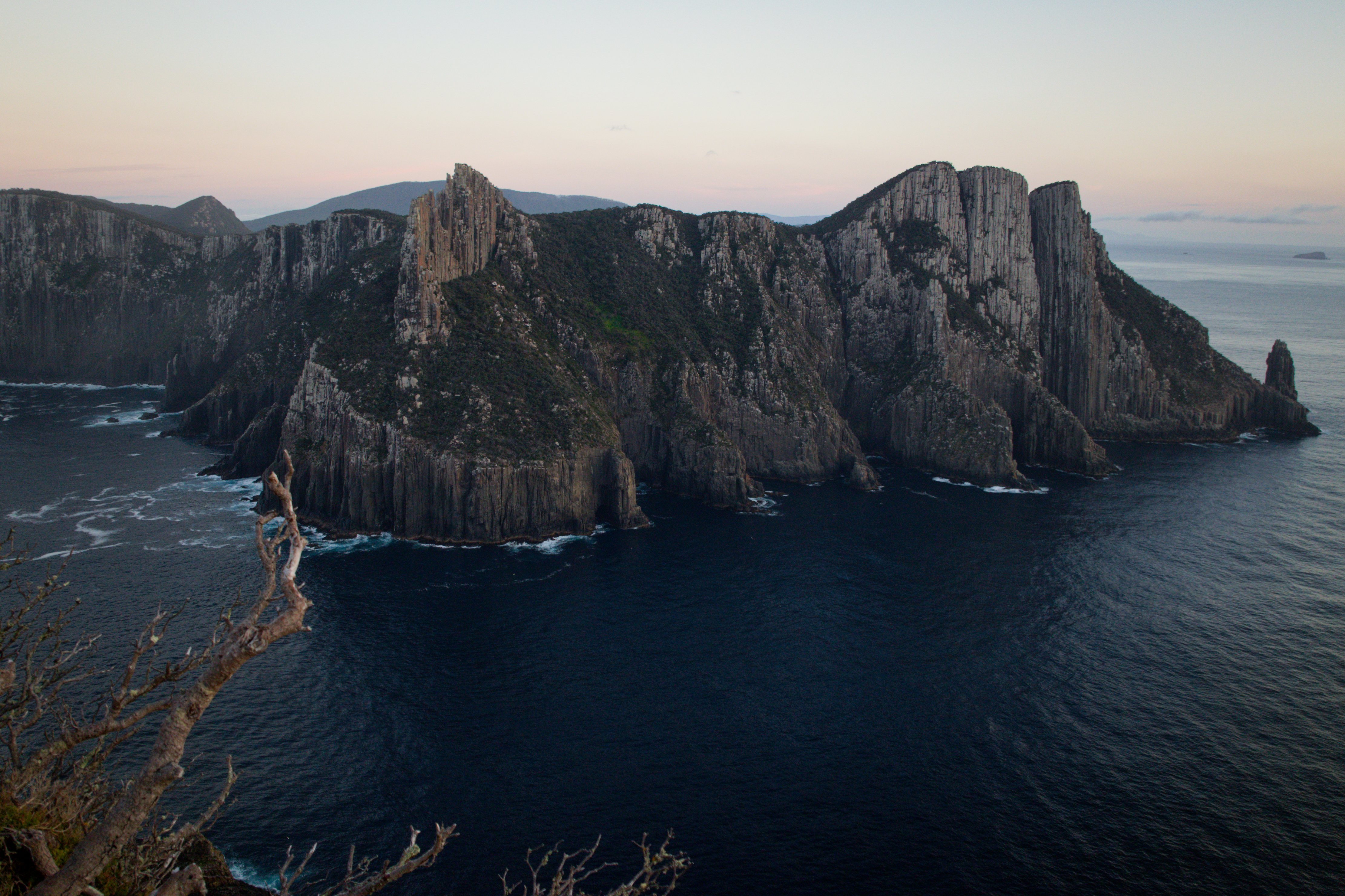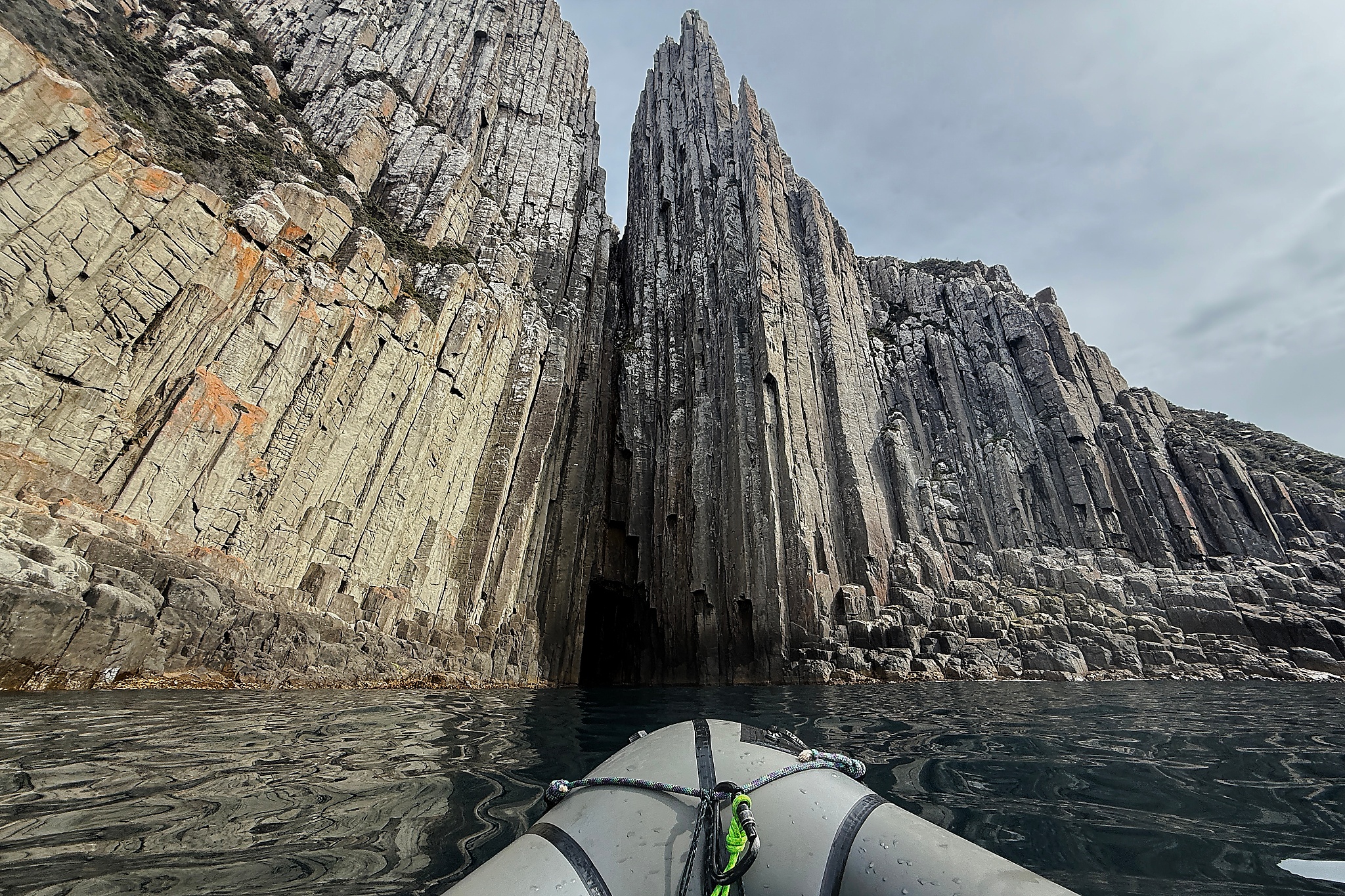 I vividly remember the first time I laid eyes on Tasman Island. It’s less than 500m across the Tasman Island Passage and yet somehow it felt a world away. Later that summer I sea kayaked out there and I knew I'd be back one day to see what wonders awaited around the corner. The following summer I hiked out to Cape Pillar with my new packraft. The swell was nearly non existent although I'm told the currents rip through the passage so I made sure to paddle across on the slack tide. A light NE wind assisted me across to the steam whinch in about half an hour.