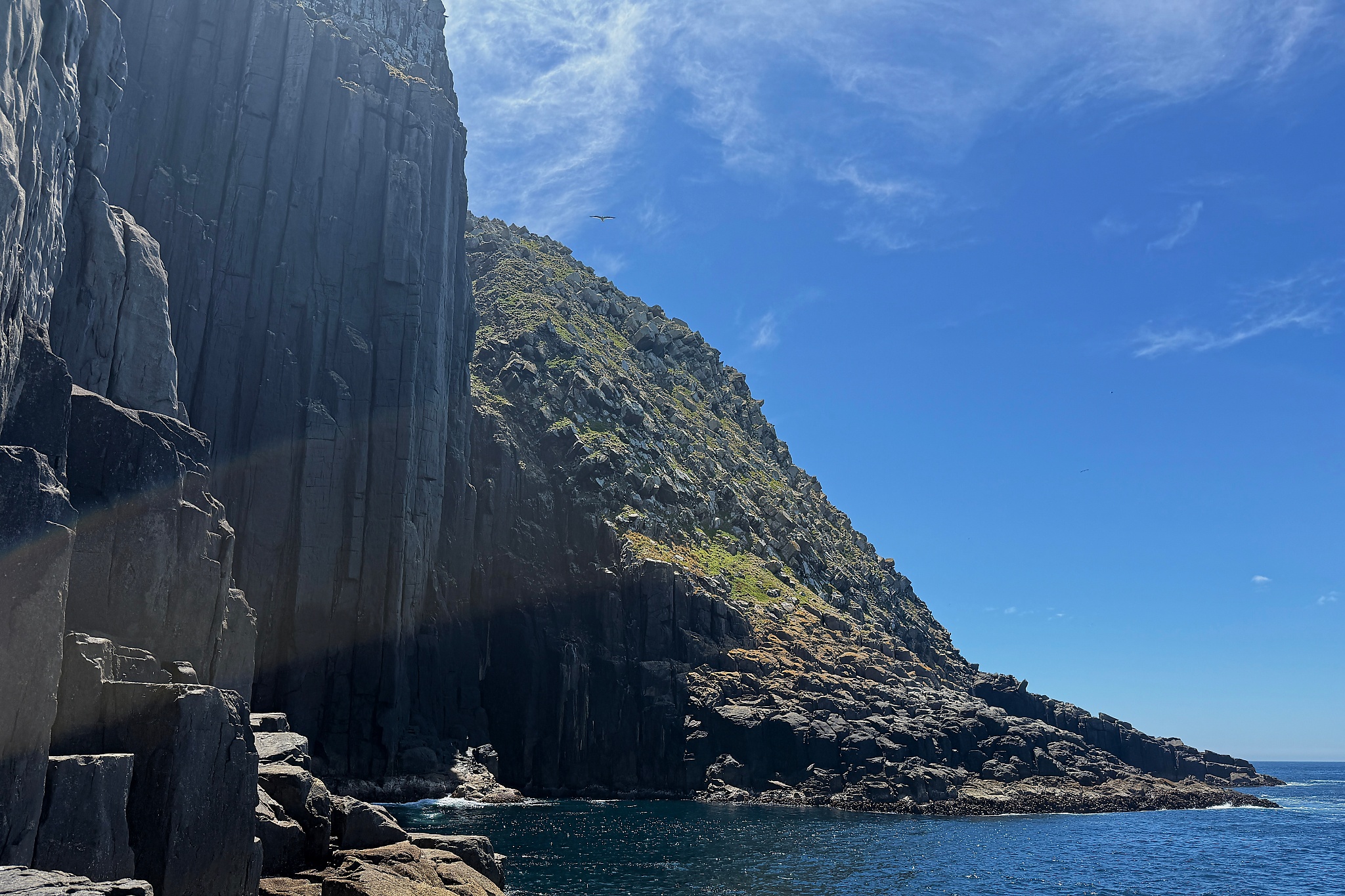 I set off at 9am from the Tasman Island steam whinch and I opted to travel clockwise to soak up as much sun as possible. From the get go it was pretty clear that the seals were going to keep me company throughout the day. The NE & E aspect of the island had some scattered sections which could be run. There were a few beautiful sea caves that required short swims. As I began to wrap around to the SE aspect of the island there were a couple slightly more committing swims and the 200m+ vertical dolerite cliffs made it feel quite dramatic. I took my first snack break while half a dozen whales feasted just off shore. A large pod of seals were smashing large pelagic fish in the midst of it all too. The water visibility was incredible on the eastern side of the island and I was stoked to have brought my mask along although I was inappropriately dressed to make the most of it. I was wearing a t-shirt and thermal bottoms and the stupidity of that decision kicked in once the southern facing cliffs sheltered me from the sun. Crossing the dolerite bridge to The Monkeys was a real highlight.