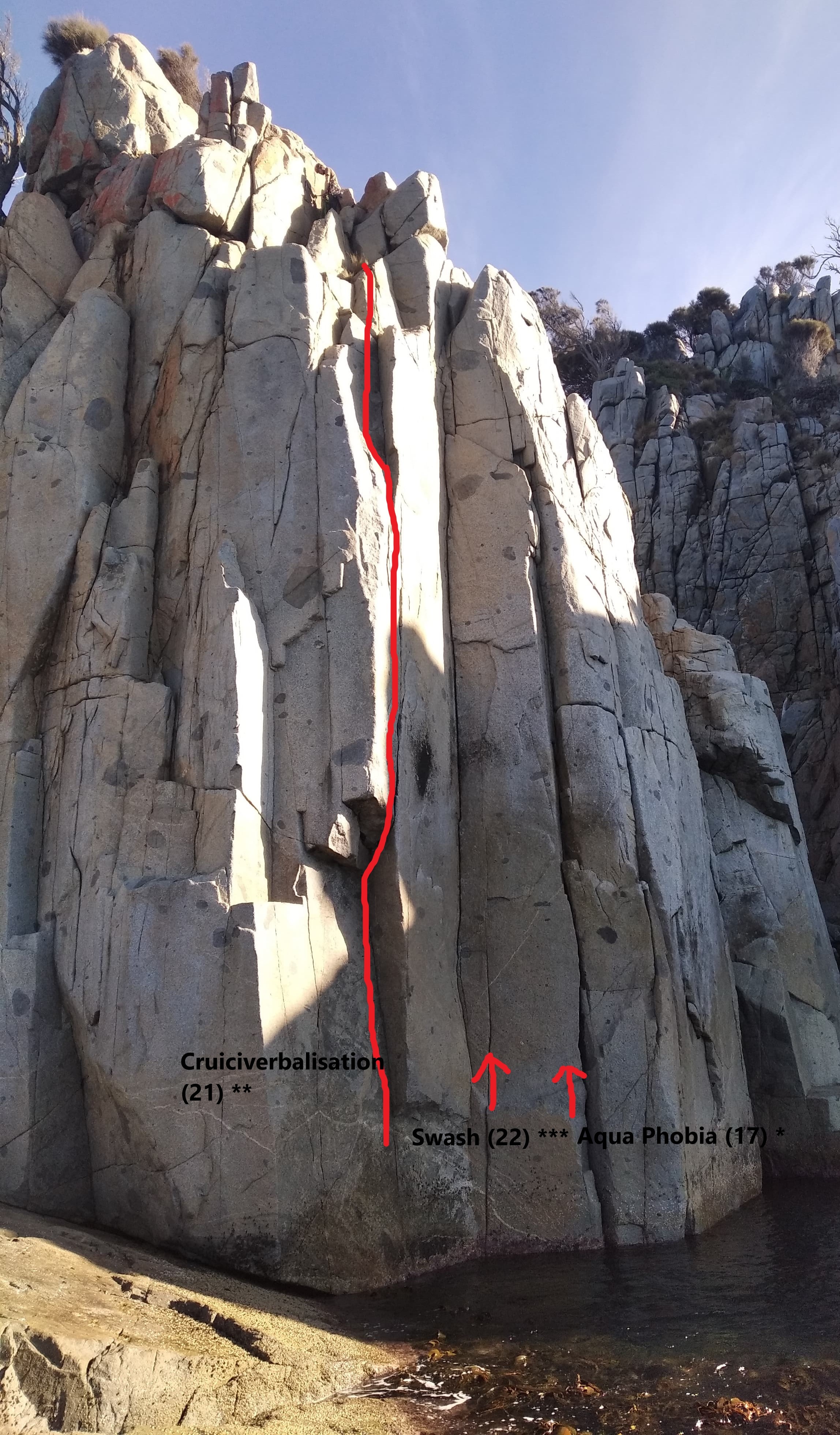 I have also bumped up the status of Swash to 3 stars. Been climbing at Freycinet for almost 10 years and I reckon this is up there with the very best mid-grade routes on the granite. Clean, sustained laybacking up an incredible corner. It seems to get almost no traffic but it deserves some love.