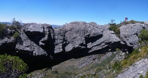 "This was fully sick, bomber quartzite rock & about 50m long, 15-20m above the ground. Quartzite. Cross the Gordon River & up a big hill for 4 hours its all yours! it of a slog to get there tho. There is also a few other cool boulders etc. on the summit ridge."